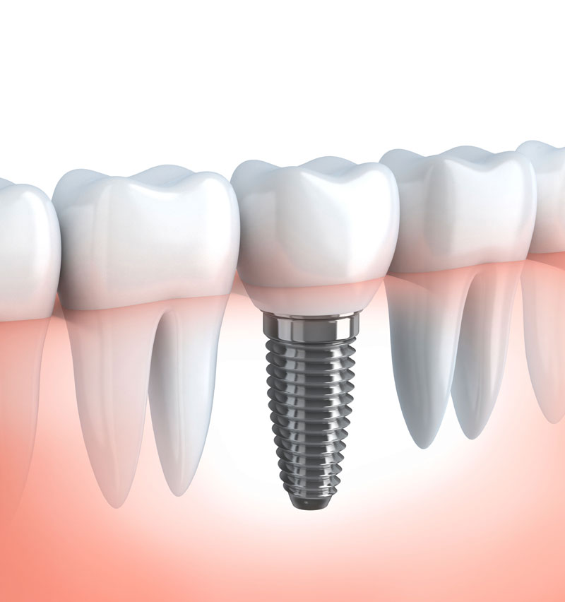 A dental implant is a titanium rod, inserted into the jaw bone, to act as a replacement for a natural root. It is usually either in the form of a screw or a cylinder and can support one or several replacement tooth. A crown, a bridge or a denture is customarily placed over the implant replace the missing tooth.